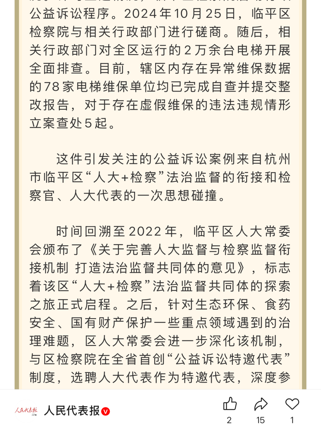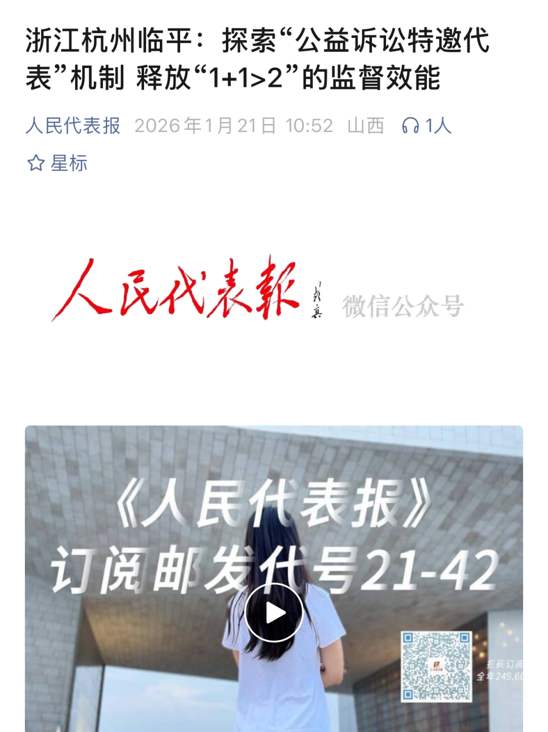 《人民代表报》是全国人大系统唯一公开发行的报纸。日前,人民代表报微信公众号以《浙江杭州临平:探索“公益诉讼特邀代表”机制 释放“1+1>2”的监督效能》为题,报道了临平区人大监督和检察监督协同联动,以“公益诉讼特邀代表”制度,推动代表建议和检察建议双向衔接转化的探索路径和办案成效。现将文章转载如下: